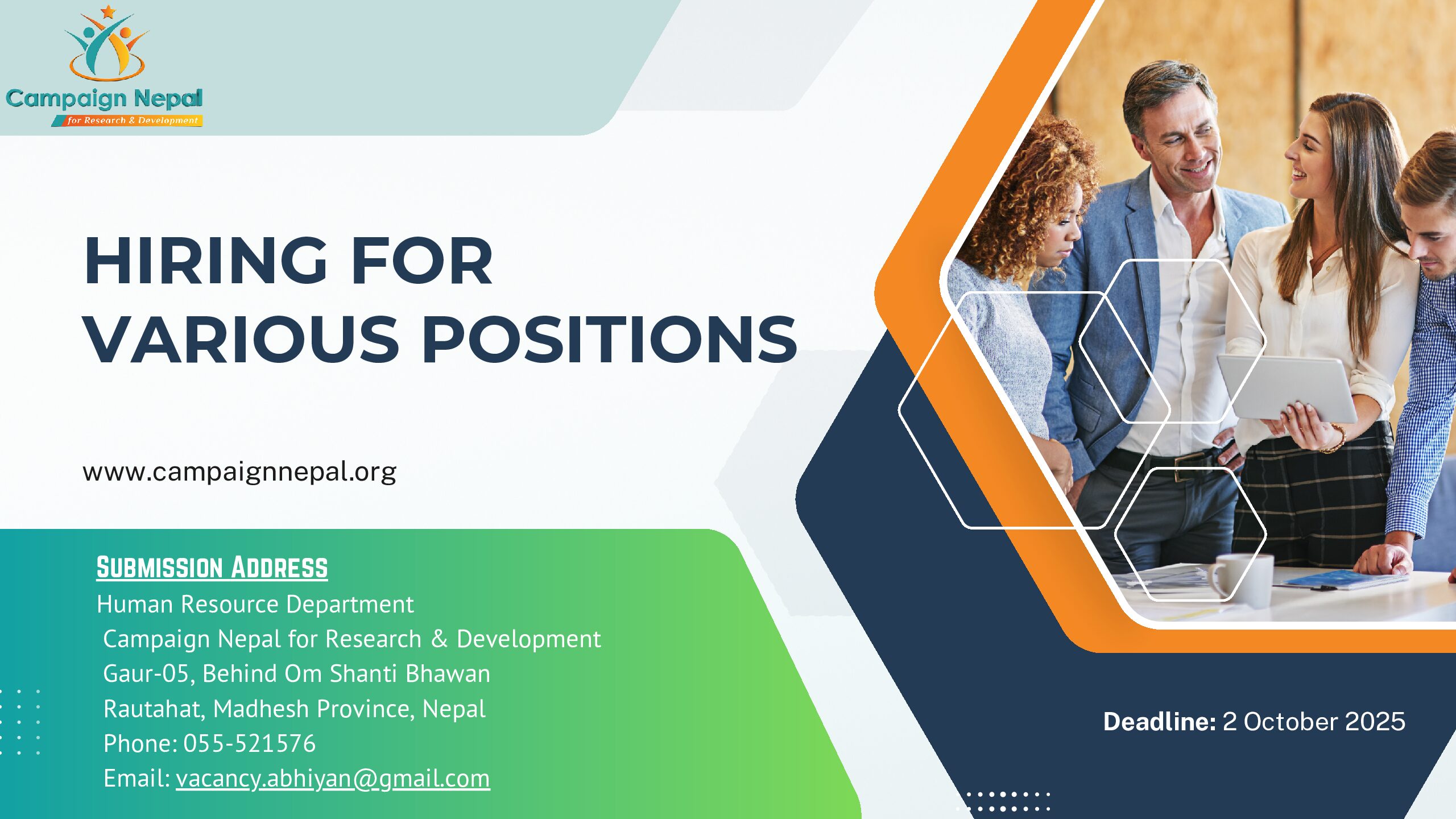 Campaign Nepal for Research & Development (hereinafter: Campaign Nepal) is a duly registered NGO based in Madhesh Province of Nepal, that was founded in 2008 to address community development and social justice issues, particularly for marginalized groups like children, youth, and women.